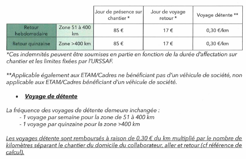 Pour les déplacements nécessitant un temps de circulation conséquent entre le domicile et le chantier, et si l’organisation du chantier ne permet pas une prise de poste décalée, le collaborateur peut être amené à opter pour un départ le dimanche de son domicile. Dans ce cas, une indemnisation correspondant à 100% de l’IGD est versée. Le collaborateur doit conserver un justificatif de son déplacement. Il est rappelé que ces heures ne sont pas assimilables à du temps de travail.