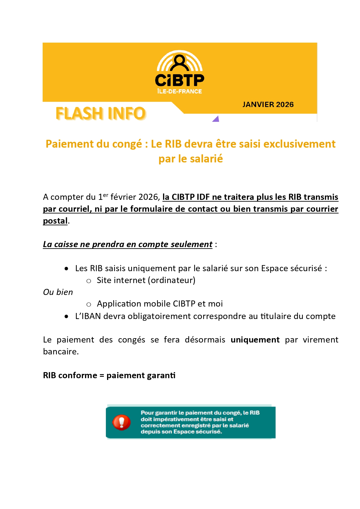 Flash info paiement des congés par la CIBTP IDF